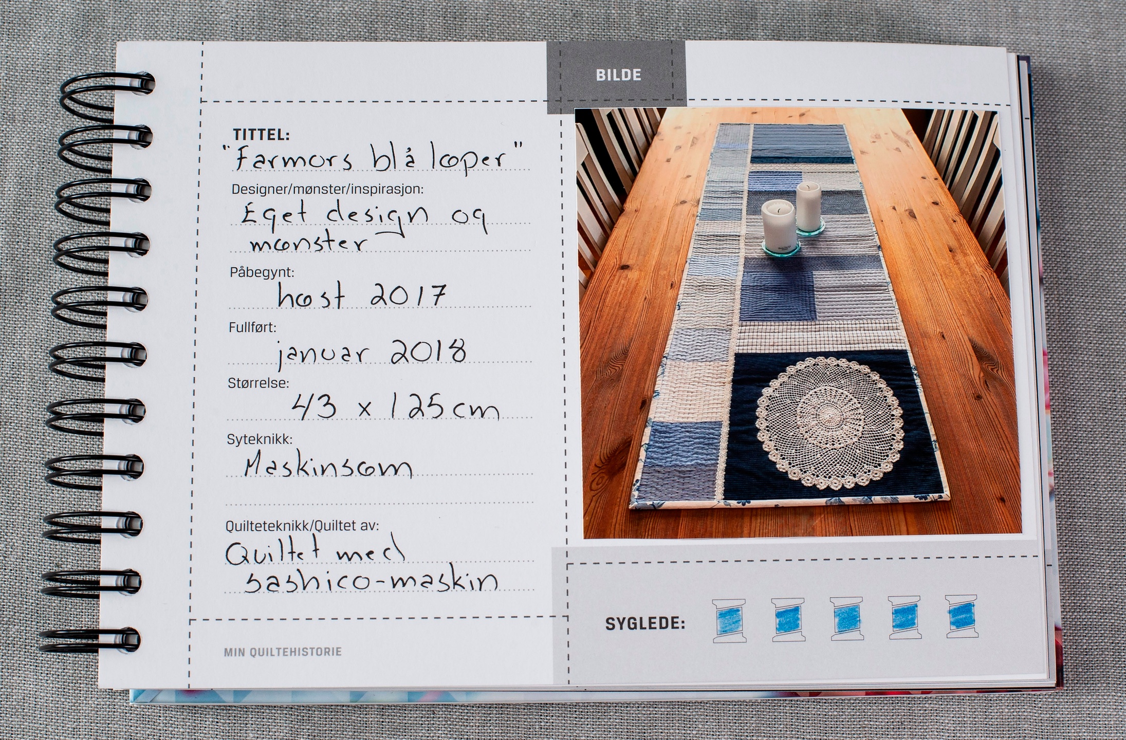 “En bok jeg håper blir mye brukt av de som syr lappeteknikk og quilter. Den er et supert utgangspunkt og hjelpemiddel for å dokumentere og skape minner om egen håndverksprosess.”